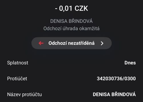 Poslat zprávupřidal/a skutečné jméno majitele účtu: Denisa Břindová k bankovnímu účtu: 342030736/0300