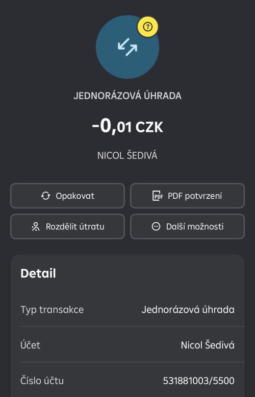 Poslat zprávupřidal/a skutečné jméno majitele účtu: Nicol Šedivá k bankovnímu účtu: 531881003/5500