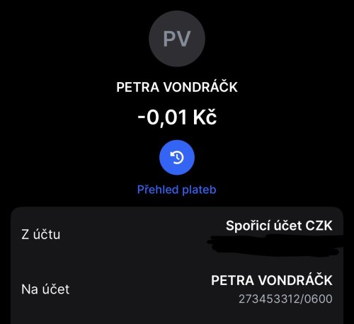 Poslat zprávupřidal/a skutečné jméno majitele účtu: Petra Vondráčková k bankovnímu účtu: 273453312/0600