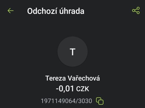 Poslat zprávupřidal/a skutečné jméno majitele účtu: Tereza Vařechová k bankovnímu účtu: 1971149064/3030