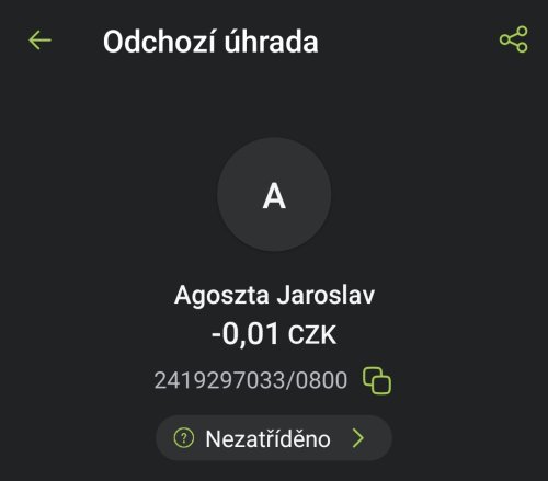 Poslat zprávupřidal/a skutečné jméno majitele účtu: Jaroslav Agoszta k bankovnímu účtu: 2419297033/0800