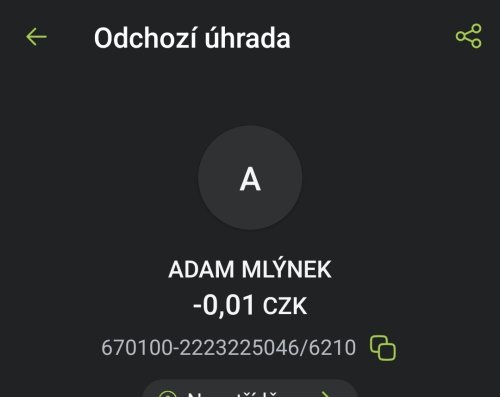 Poslat zprávupřidal/a skutečné jméno majitele účtu: Adam Mlýnek k bankovnímu účtu: 670100-2223225046/6210