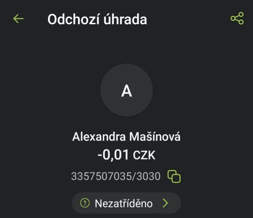 Poslat zprávupřidal/a skutečné jméno majitele účtu: Alexandra Mašínová k bankovnímu účtu: 3357507035/3030