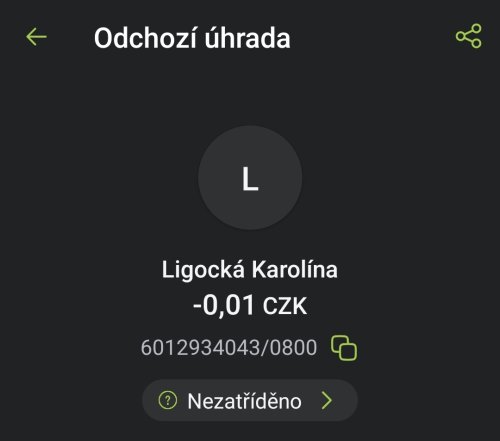 Poslat zprávupřidal/a skutečné jméno majitele účtu: Karolína Ligocká k bankovnímu účtu: 6012934043/0800