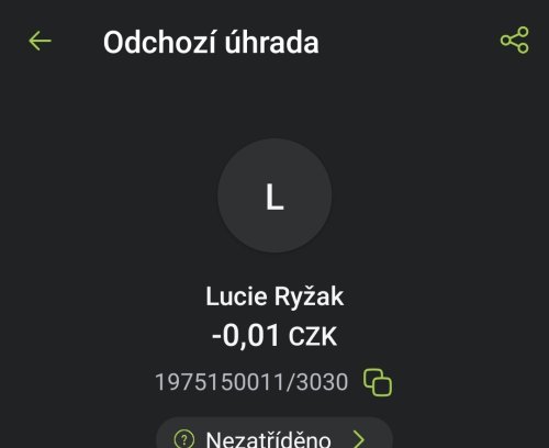Poslat zprávupřidal/a skutečné jméno majitele účtu: Lucie Ryžak k bankovnímu účtu: 1975150011/3030