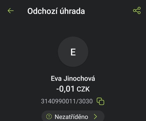 Poslat zprávupřidal/a skutečné jméno majitele účtu: Eva Jinochová k bankovnímu účtu: 3140990011/3030