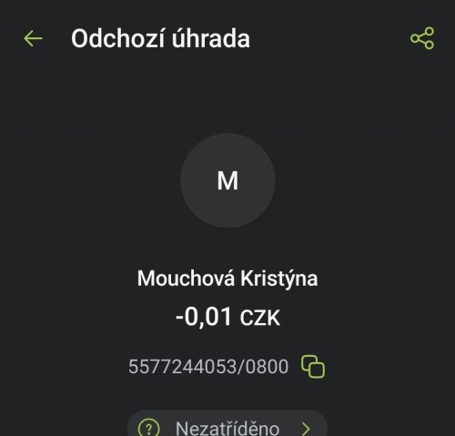 Poslat zprávupřidal/a skutečné jméno majitele účtu: Kristýna Mouchová k bankovnímu účtu: 5577244053/0800