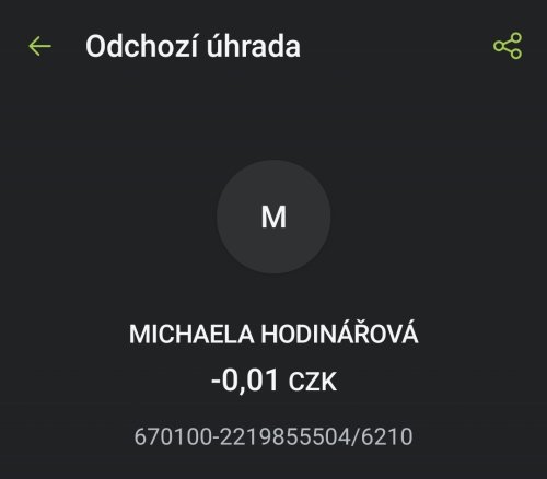 Poslat zprávupřidal/a skutečné jméno majitele účtu: Michaela Hodinářová k bankovnímu účtu: 670100-2219855504/6210