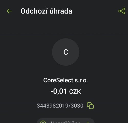 Poslat zprávupřidal/a skutečné jméno majitele účtu: CoreSelect s.r.o. k bankovnímu účtu: 3443982019/3030