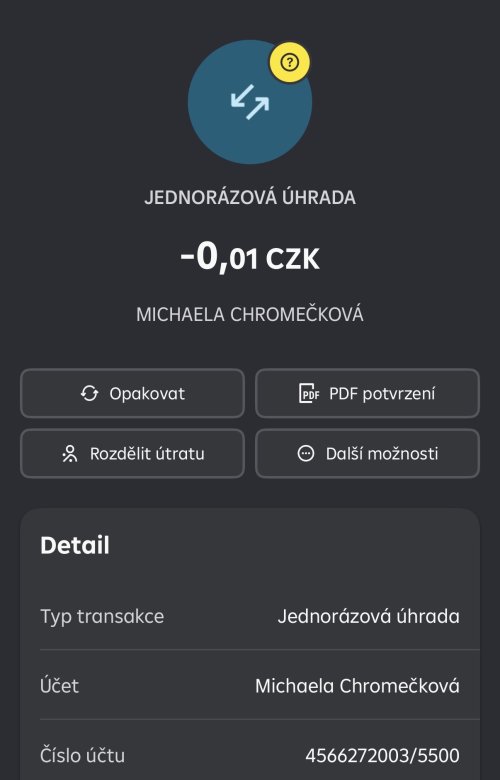 Poslat zprávupřidal/a skutečné jméno majitele účtu: Michaela Chromečková k bankovnímu účtu: 4566272003/5500
