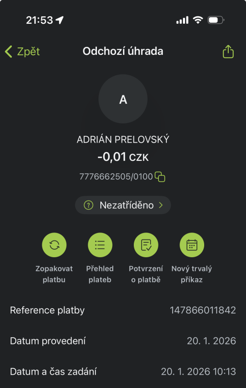 Poslat zprávupřidal/a skutečné jméno majitele účtu: Adrián Prelovský k bankovnímu účtu: 7776662505/0100