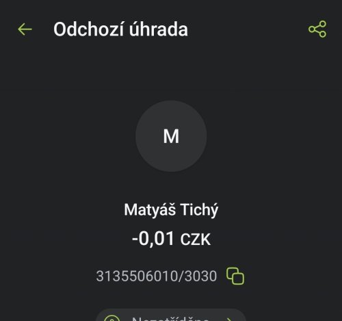 Poslat zprávupřidal/a skutečné jméno majitele účtu: Matyáš Tichý k bankovnímu účtu: 3135506010/3030