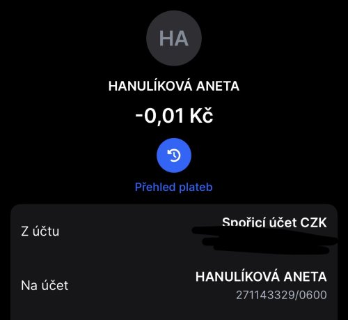 Poslat zprávupřidal/a skutečné jméno majitele účtu: Aneta Hanulíková k bankovnímu účtu: 271143329/0600