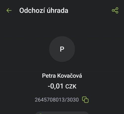 Poslat zprávupřidal/a skutečné jméno majitele účtu: Petra Kovačová k bankovnímu účtu: 2645708013/3030