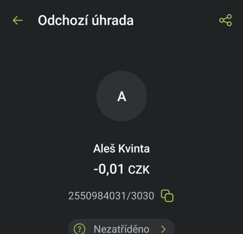 Poslat zprávupřidal/a skutečné jméno majitele účtu: Aleš Kvinta k bankovnímu účtu: 2550984031/3030