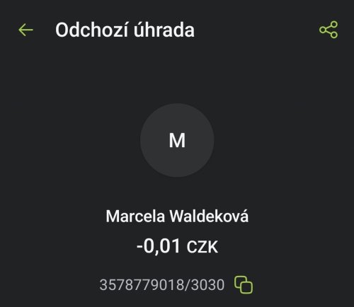 Poslat zprávupřidal/a skutečné jméno majitele účtu: Marcela Waldeková k bankovnímu účtu: 3578779018/3030