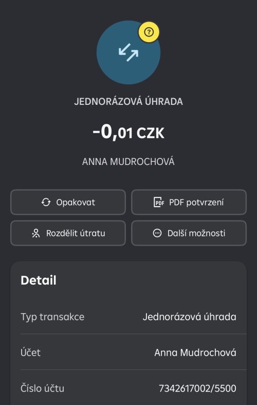 Poslat zprávupřidal/a skutečné jméno majitele účtu: Anna Mudrochová k bankovnímu účtu: 7342617002/5500