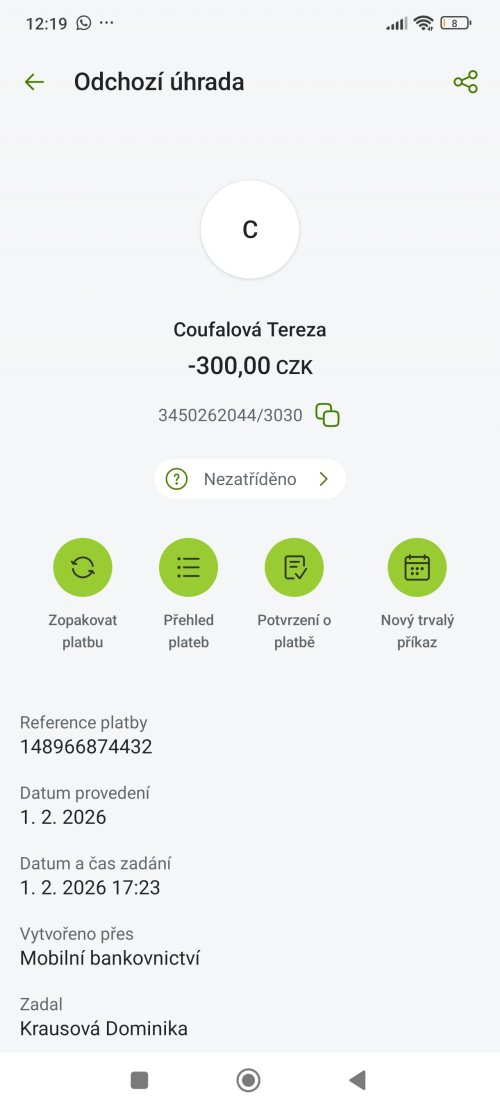 přidal/a skutečné jméno majitele účtu: Tereza Coufalová k bankovnímu účtu: 3450262044/3030