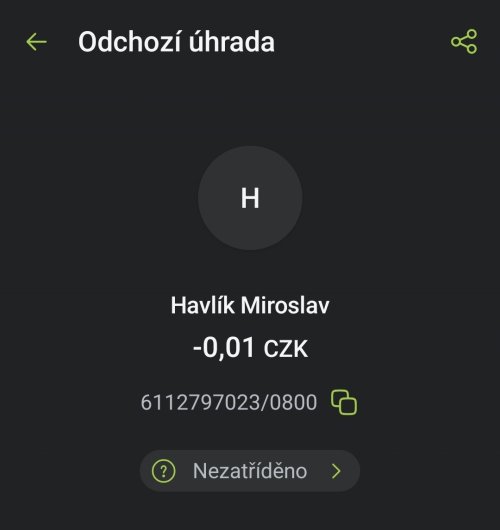 Poslat zprávupřidal/a skutečné jméno majitele účtu: Miroslav Havlík k bankovnímu účtu: 6112797023/0800