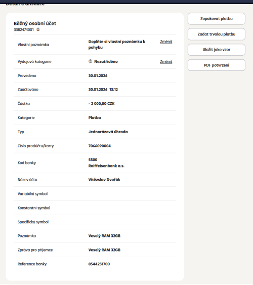 Poslat zprávupřidal/a skutečné jméno majitele účtu: Vítězslav Dvořák k bankovnímu účtu: 7066090004/5500
