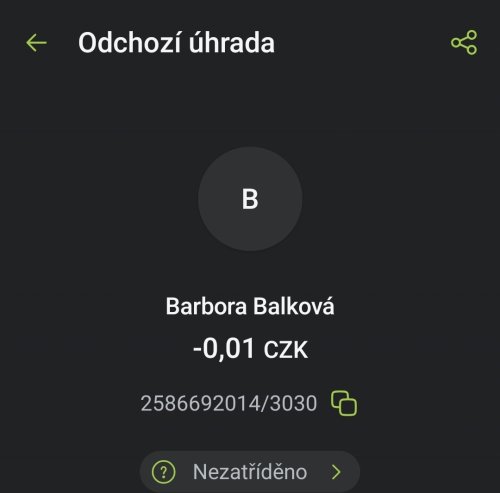 Poslat zprávupřidal/a skutečné jméno majitele účtu: Barbora Balková k bankovnímu účtu: 2586692014/3030