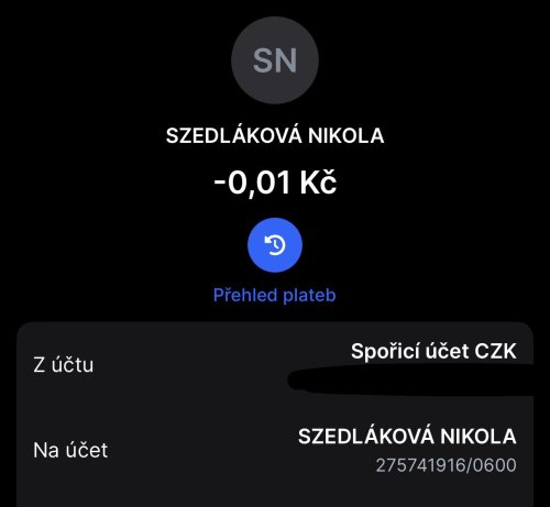 Poslat zprávupřidal/a skutečné jméno majitele účtu: Nikola Szedláková k bankovnímu účtu: 275741916/0600