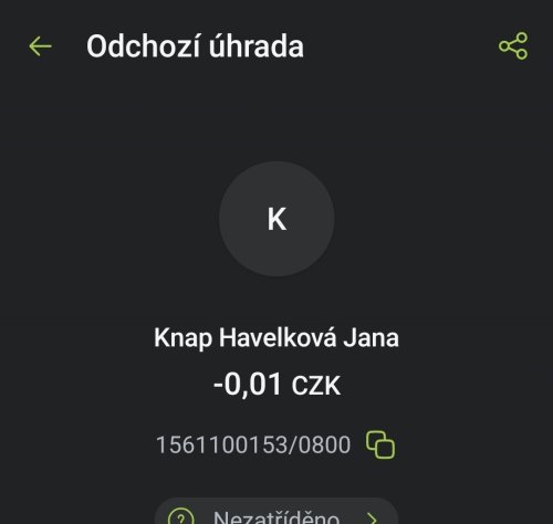 Poslat zprávupřidal/a skutečné jméno majitele účtu: Jana Knap Havelková k bankovnímu účtu: 1561100153/0800