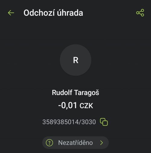 Poslat zprávupřidal/a skutečné jméno majitele účtu: Rudolf Taragoš k bankovnímu účtu: 3589385014/3030