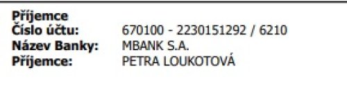Poslat zprávupřidal/a skutečné jméno majitele účtu: Petra Loukotová k bankovnímu účtu: 670100-2230151292/6210