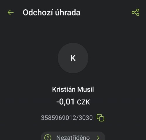 Poslat zprávupřidal/a skutečné jméno majitele účtu: Kristián Musil k bankovnímu účtu: 3585969012/3030