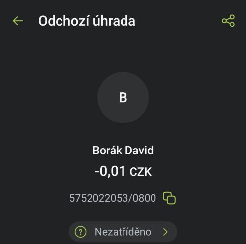 Poslat zprávupřidal/a skutečné jméno majitele účtu: David Borák k bankovnímu účtu: 5752022053/0800