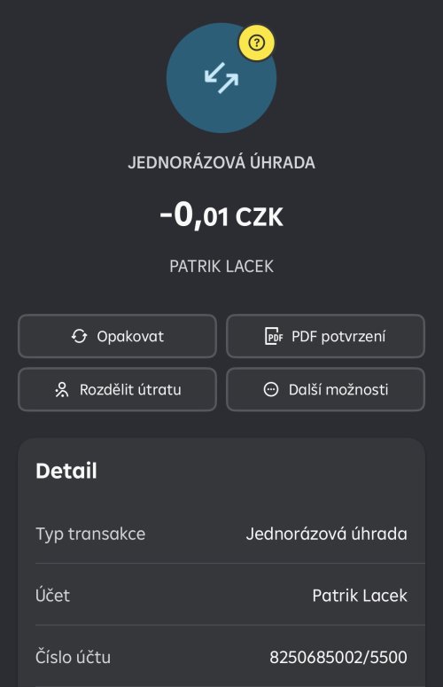Poslat zprávupřidal/a skutečné jméno majitele účtu: Patrik Lacek k bankovnímu účtu: 8250685002/5500