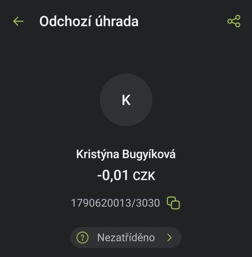 Poslat zprávupřidal/a skutečné jméno majitele účtu: Kristýna Budyíková k bankovnímu účtu: 1790620013/3030