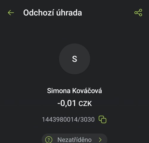 Poslat zprávupřidal/a skutečné jméno majitele účtu: Simona Kováčová k bankovnímu účtu: 1443980014/3030