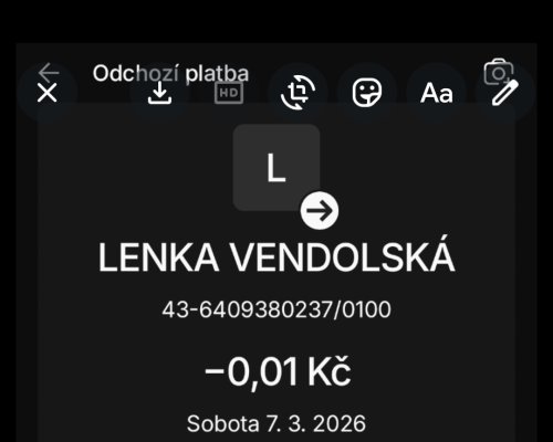 Poslat zprávupřidal/a skutečné jméno majitele účtu: Lenka Vendolská k bankovnímu účtu: 43-6409380237/0100