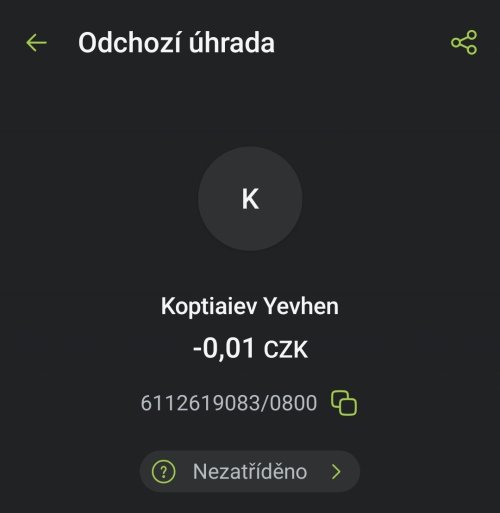 Poslat zprávupřidal/a skutečné jméno majitele účtu: Yevhen Koptiaiev k bankovnímu účtu: 6112619083/0800