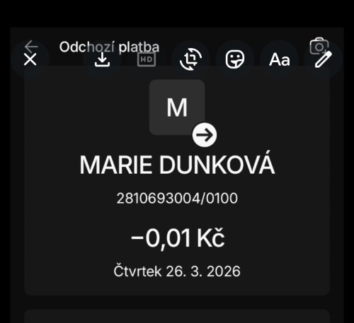 Osoba mě kontaktovala přes aplikaci Tinder, komunikace pokračovala přes Facebook Messenger. Vydávala se za matku s nemocným dítětem, tvářila se že nemá peníze na jídlo a léky, pracuje na brigádě v prádelně a má dluhy po bývalém partnerovi. Po zaslání 1 000 Kč na uvedený účet slíbila vrácení peněz 25. 3. 2026. K vrácení nedošlo, od té doby nekontaktní. Pravděpodobně oslovuje více mužů na Tinderu se stejným příběhem. Pozor, klasický romance scam.