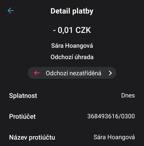 Poslat zprávupřidal/a skutečné jméno majitele účtu: Sára Hoangová k bankovnímu účtu: 368493616/0300