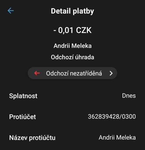 Poslat zprávupřidal/a skutečné jméno majitele účtu: Andrii Meleka k bankovnímu účtu: 362839428/0300