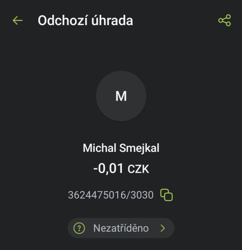 Poslat zprávupřidal/a skutečné jméno majitele účtu: Michal Smejkal k bankovnímu účtu: 3624475016/3030
