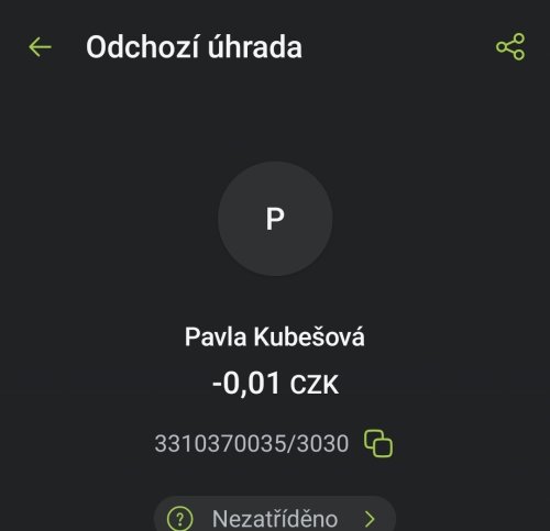 Poslat zprávupřidal/a skutečné jméno majitele účtu: Pavla Kubešová k bankovnímu účtu: 3310370035/3030