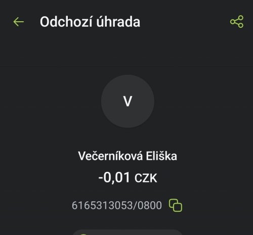 Poslat zprávupřidal/a skutečné jméno majitele účtu: Eliška Večerníková k bankovnímu účtu: 6165313053/0800