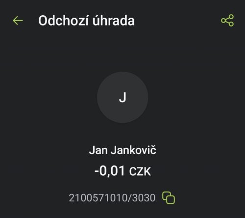 Poslat zprávupřidal/a skutečné jméno majitele účtu: Jan Jankovič k bankovnímu účtu: 2100571010/3030