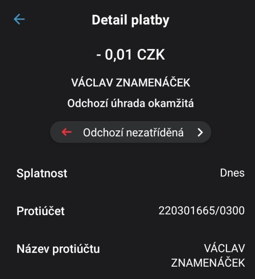 Poslat zprávupřidal/a skutečné jméno majitele účtu: Václav Znamenáčeķ k bankovnímu účtu: 220301665/0300