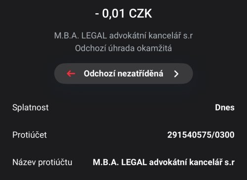 Poslat zprávupřidal/a skutečné jméno majitele účtu: M.B.A. LEGAL advokátní kancelář s.r.o. k bankovnímu účtu: 291540575/0300