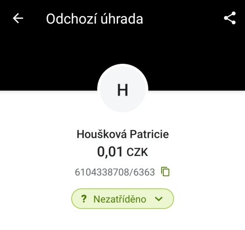 Poslat zprávupřidal skutečné jméno majitele účtu: Patricie Houšková k bankovnímu účtu: 313103/0100